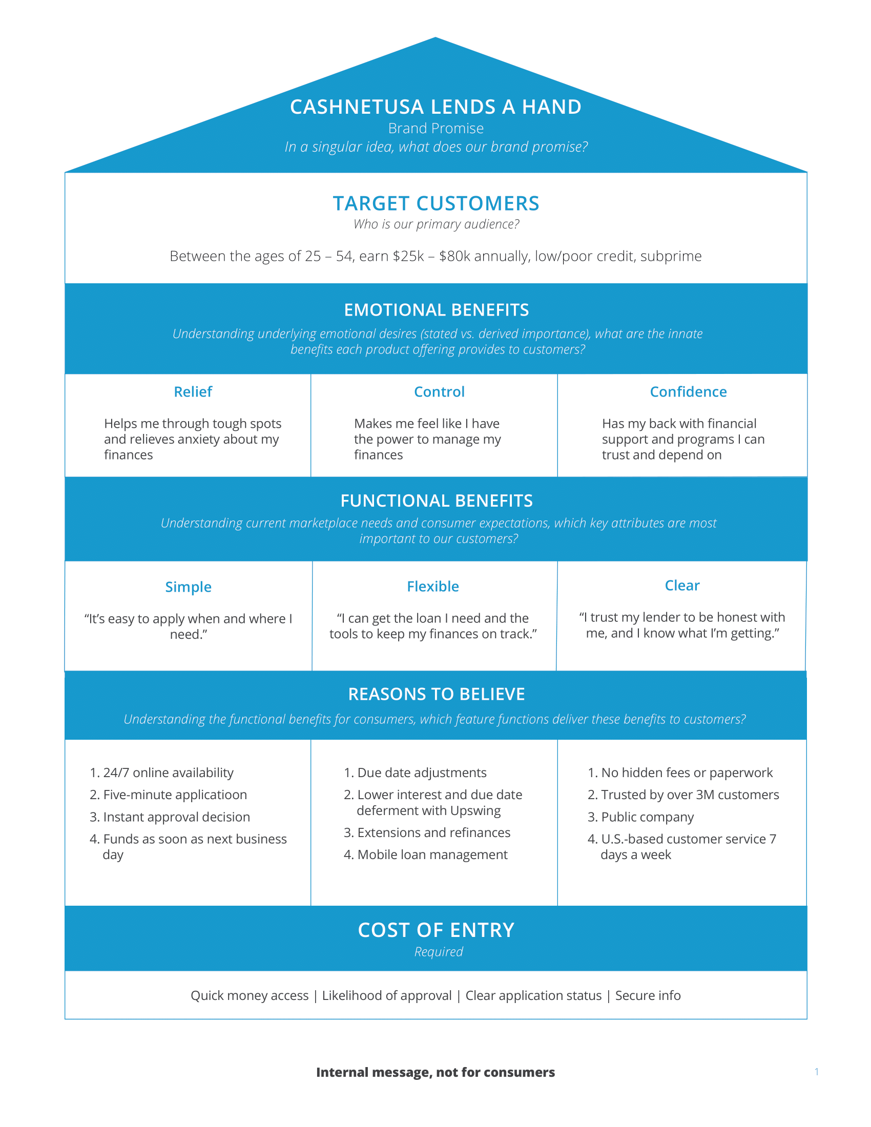 At Enova, I worked closely with senior brand managers and the Chief Marketing Officer to focus and tighten messaging strategies for some of our most prominent brands. I created the two architectures below to use as a tool when crafting any communication: Does the communication support the brand promise? Does it appeal to an emotional benefit? Does it use a functional benefit to make that appeal? And is it supported by concrete reasons to believe?